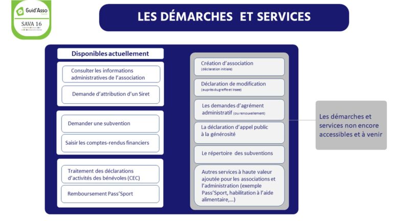 Voici la liste des démarches et services disponibles (colonne de gauche), ainsi que ceux à venir ou potentiels (colonne de droite) :
